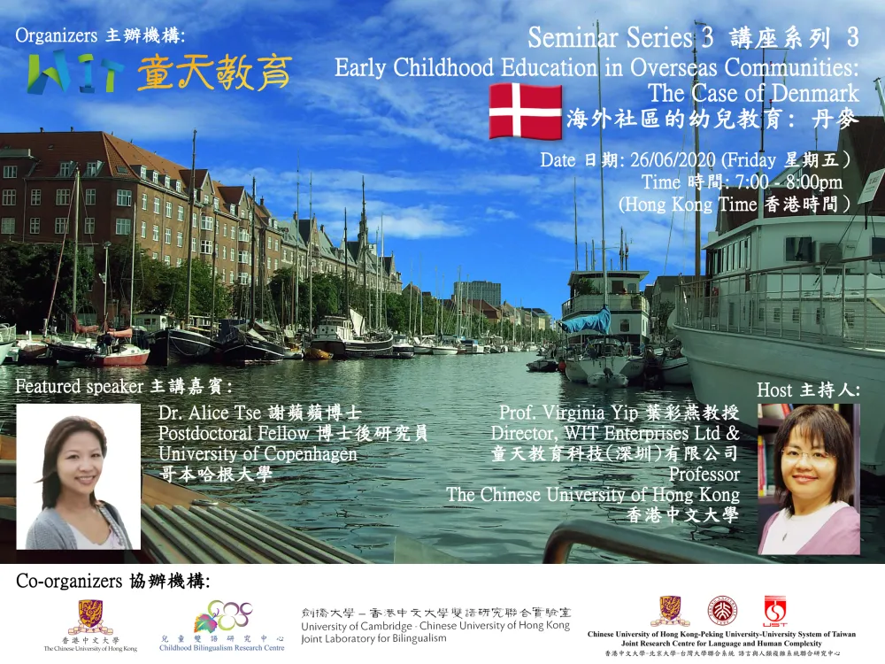 WIT – News 2020 Jun WIT Enterprises Ltd.We Invest in Tomorrow. From Infancy to Infinity Home About Us Chairperson’s Message Services Products Experts and Team News Jun, Online ForumsEarly Childhood Education in Overseas Communities:The Case of Denmark (Online Forum)June 16, 2020 Date: 26 June 2020 (Friday)Time: 7:00 pm – 8:00 pmSpeaker: Dr. Alice Tse, Postdoctoral Fellow, University of CopenhagenHost: Prof. Virginia YipOnline platform for the event: Zoom (Meeting info will be sent to the registered participants one day before the seminar)